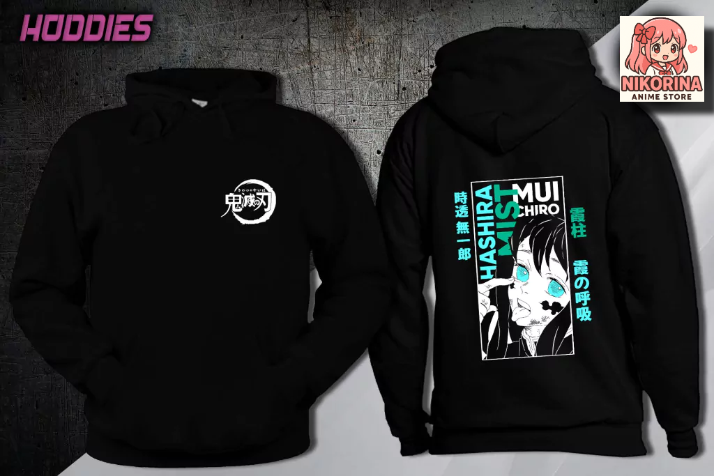 Buzo Canguro Muichiro, Estampado grande en la espalda, logo Demon Slayer en el frente.